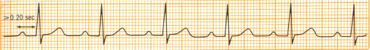 Rhythmic impulses originating in the SA node are conducted abnormally slow through the AV junction to the ventricles. The rhythm pattern is similar to normal sinus rhythm except that the PR interval is prolonged beyond 0.20 sec in adults and 0.18 sec in children. With a severe (i.e. greater than 0.5 sec) lengthening of the PR interval or with a rapid rate, the P wave may be superimposed on the preceding T wave. Occasionally the rate may be slower than 60/minute. Frequently associated with vagotonia (in which case it disappears after exercise or atropine).