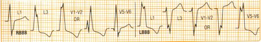 Impulses originate in the SA node and spread normally through the atria and AV junction, however, the conduction through the right (R) or left (L) branches of the bundle of His is blocked. In RBBB the right ventricle is activated late through the septum this being reflected by M-shaped QRS complex or wide notched or slurred R in V1-V2 and wide slurred S in V5-V6. In LBBB the left ventricle is activated late through the septum this being relected by M-shaped QRS or wide notched or slurred R in V5-V6 and wide slurred S or QS in V1-V6. QRS duration 0.11 sec or more. ST segment depressed and T inverted in leads with M-shaped QRS.